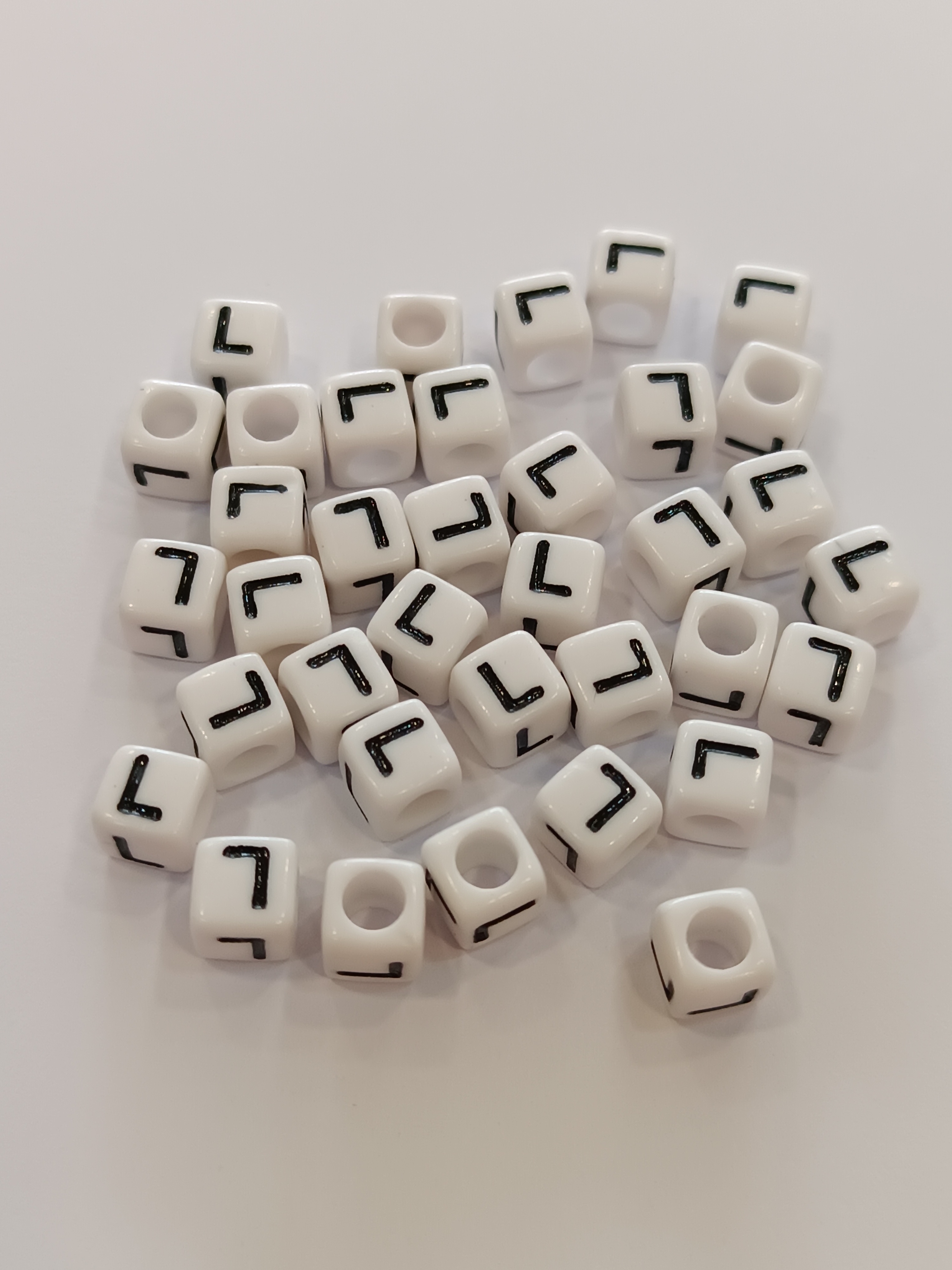 Műanyag gyöngy,fehér alapon fekete L-betűvel.