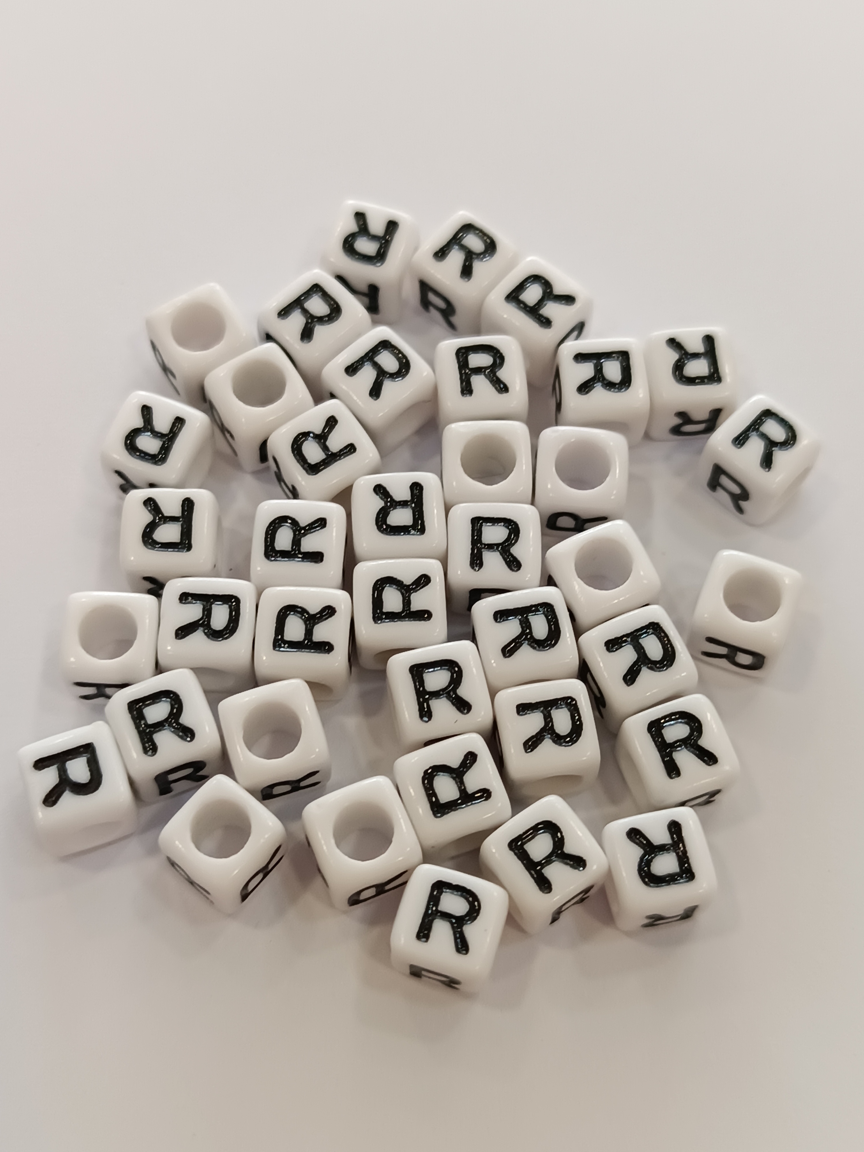 Műanyag betűgyöngy,fehér alapon fekete R-betűvel.
