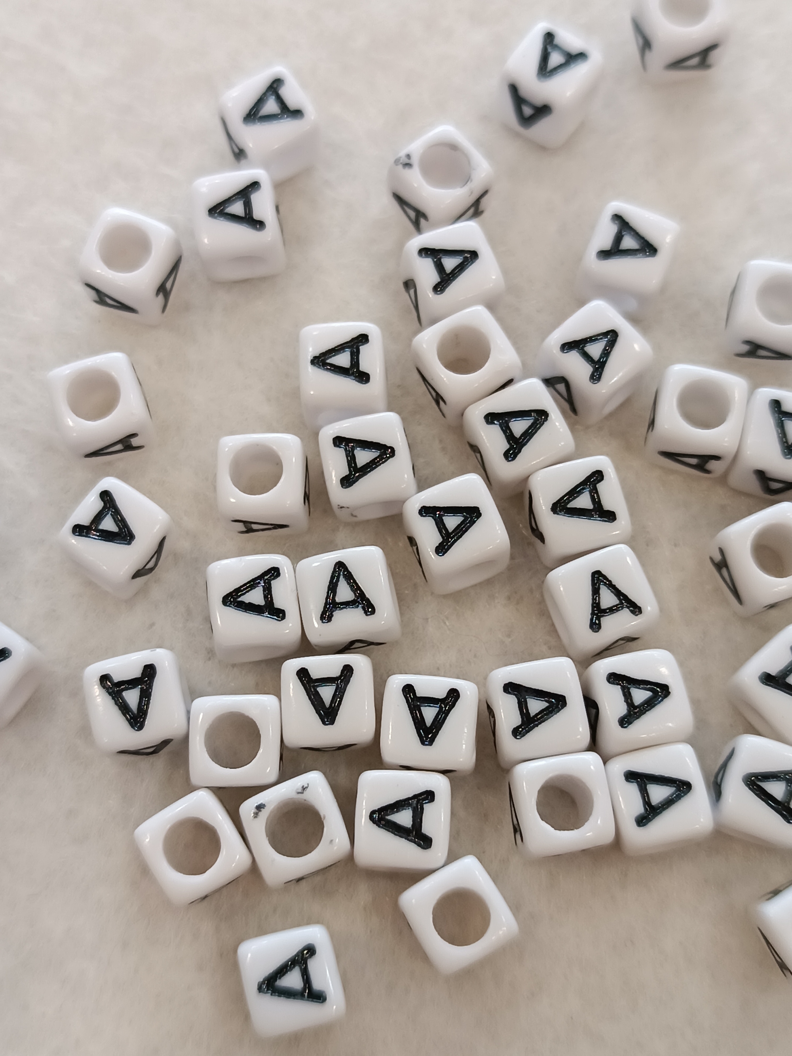 Műanyag gyöngy,fehér alapon fekete A-betűvel.