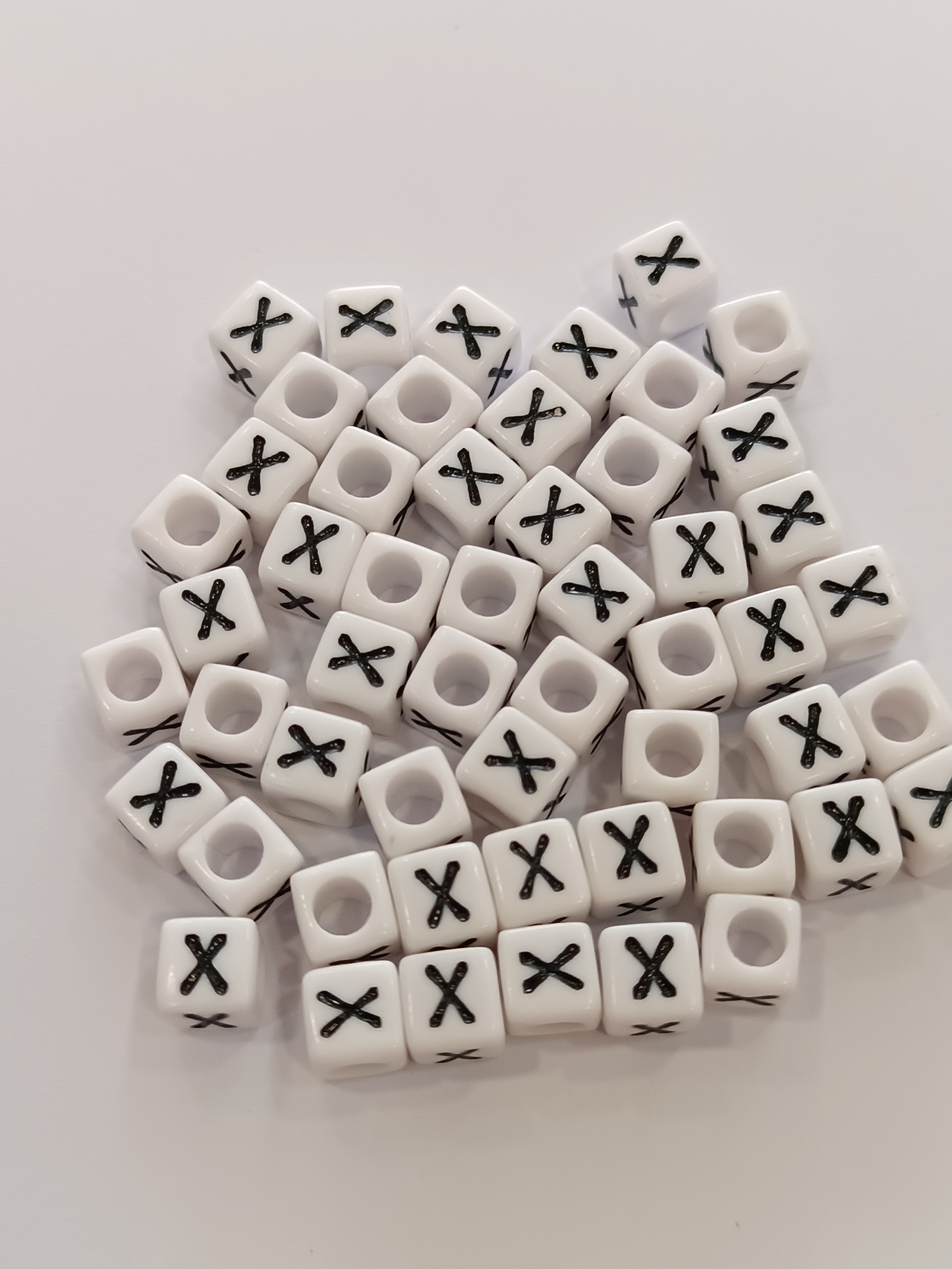 Műanyag gyöngy,fehér alapon fekete X-betűvel.
