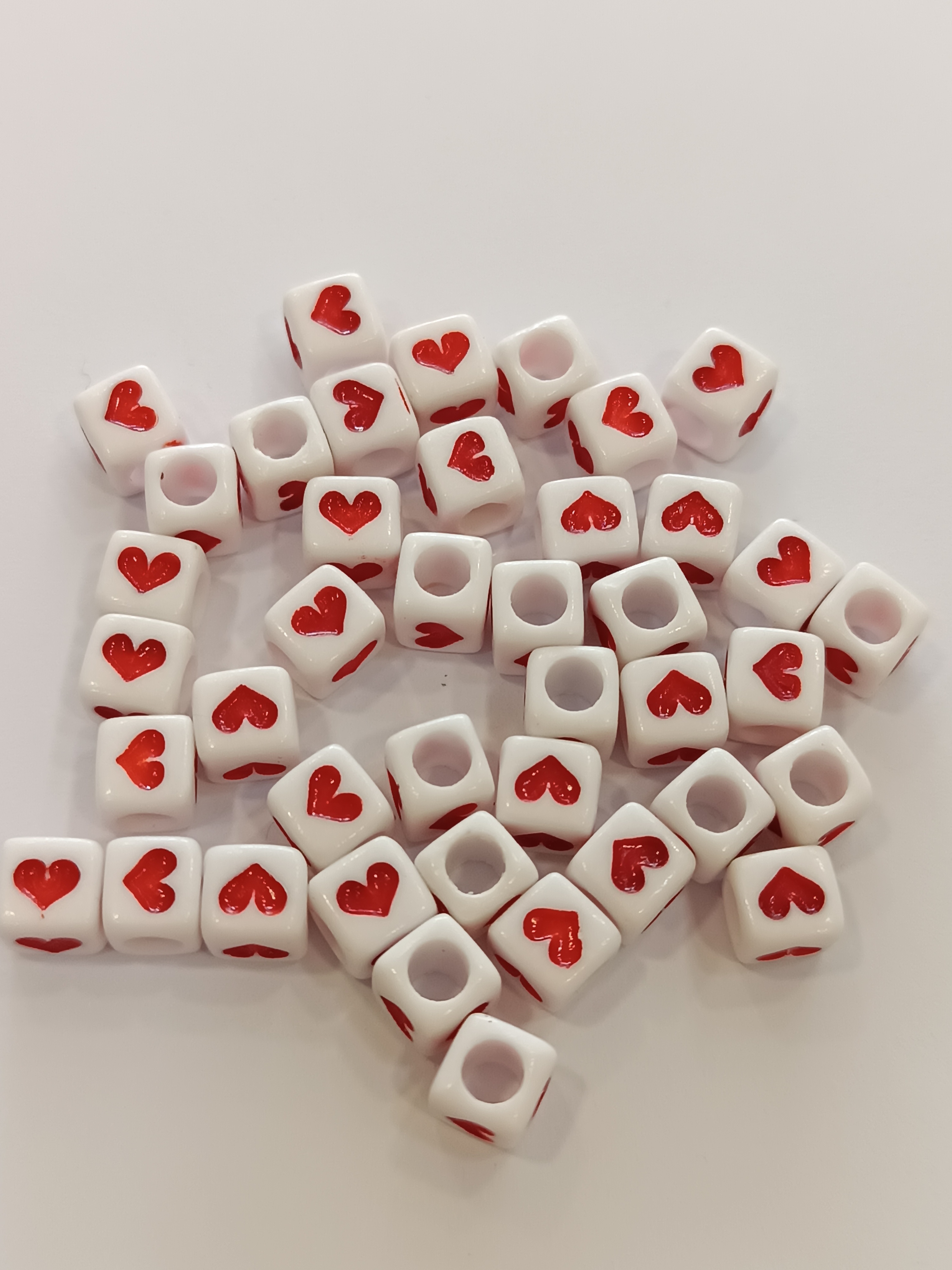 Műanyag gyöngy,fehér alapon piros szív karakterrel.
